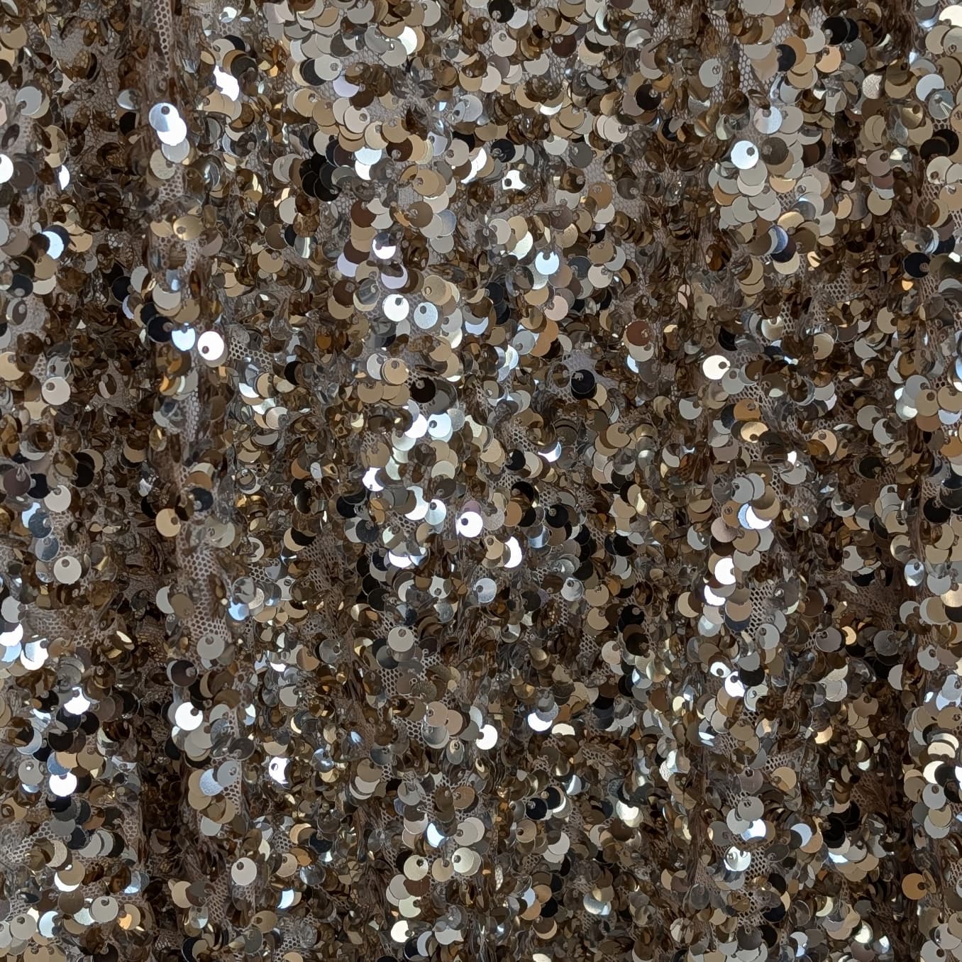 Descrizione: Il tessuto Sequin "ARIANA" della nostra esclusiva Gold Edition è l'emblema della luminosità e dell'eleganza. Caratterizzato da un'abbondanza di paillettes rotonde di piccole dimensioni, sapientemente applicate su una base elastica in poliestere, offre una superficie scintillante e dinamica. Le paillettes riflettono la luce con un effetto cangiante che spazia dall'oro all'argento scuro, conferendo al tessuto un aspetto lussuoso e un'energia vibrante. La sua struttura permette un'ottima caduta e una vestibilità confortevole, nonostante la ricchezza delle applicazioni.